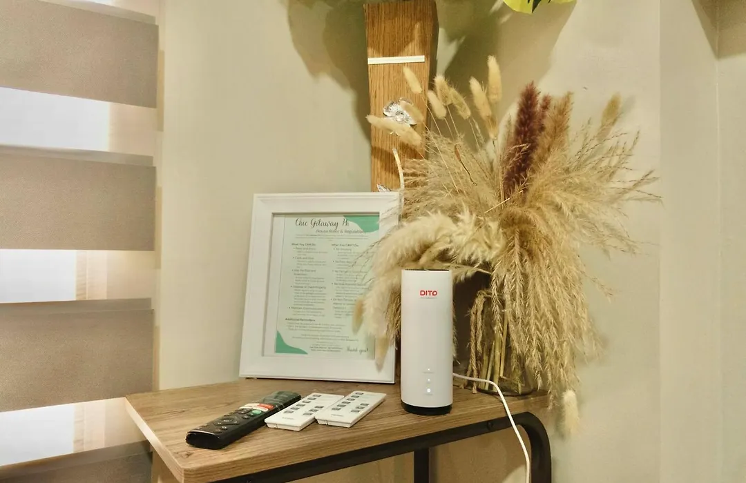 Chic Getaway Near Airportアパートメント内の設備の整った台所で、お好みの食事を快適に調理できます。 アパートから350メートル離れた所ほどのところにSaulog Terminalバス停があります。